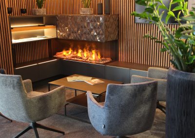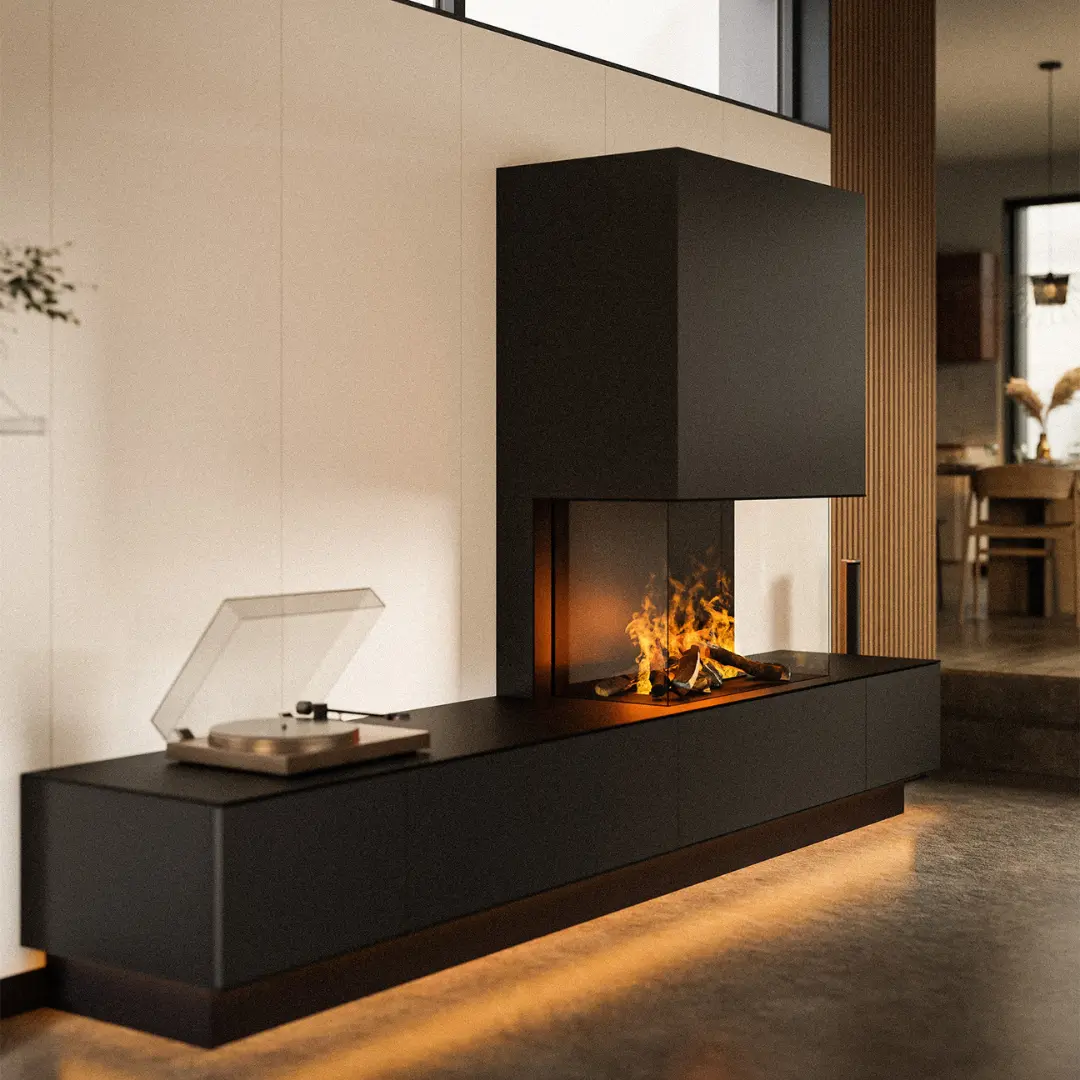 Das Geheimnis dieser Technik liegt in der Illusion: Fein vernebeltes Wasser wird durch Luftströme bewegt und von warmem LED-Licht erleuchtet. So entstehen lebendige, tanzende Flammen, die kaum vom echten Feuer zu unterscheiden sind. Gleichzeitig verbessert die natürliche Luftbefeuchtung das Raumklima – ein spürbarer Unterschied, den man atmet.