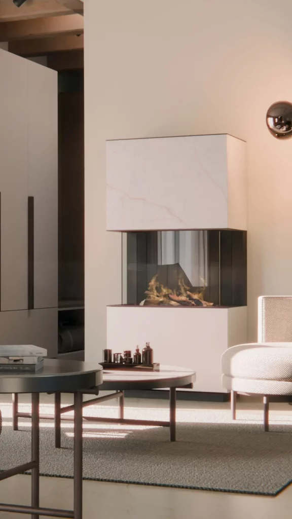 Elyn Mix verbindet das Beste aus zwei Welten: Der Unterbau aus robustem Stahl sorgt für Stabilität und klare Linien, während der Oberbau aus edler Keramik dem Kamin ein elegantes, wohnliches Finish verleiht. So entsteht ein moderner Elektrokamin, der Design und Funktion ideal vereint.
