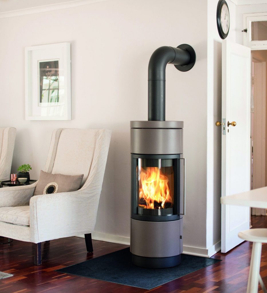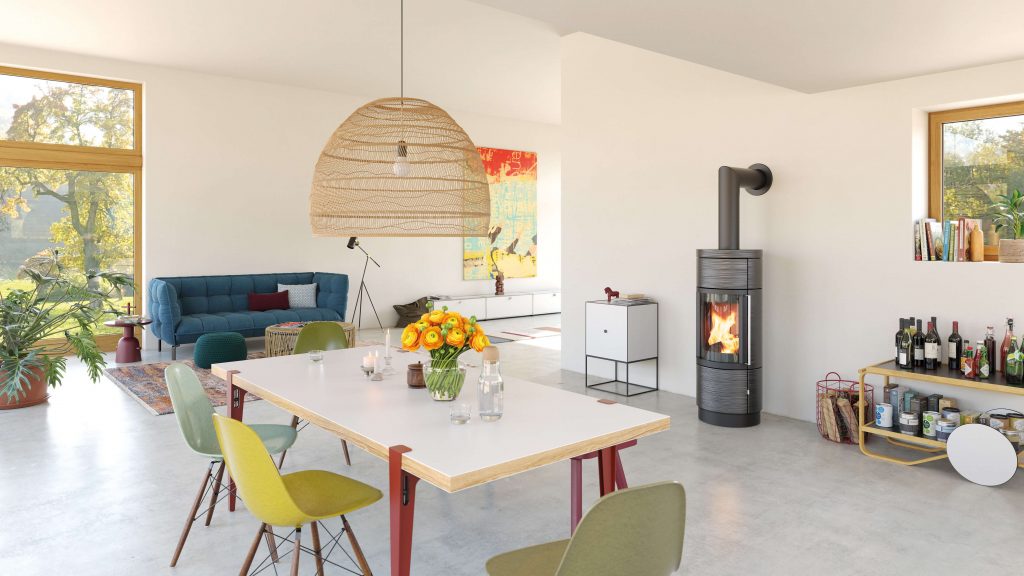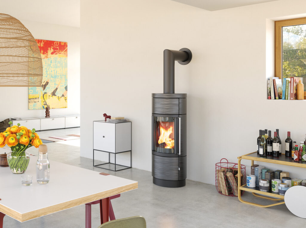 Der drehbare, zylindrische Ofenkörper erlaubt eine beeindruckende Sicht auf das Flammenspiel – aus einem Winkel von bis zu 225°. So wird das Feuer zum Zentrum des Raumes, egal aus welcher Perspektive.