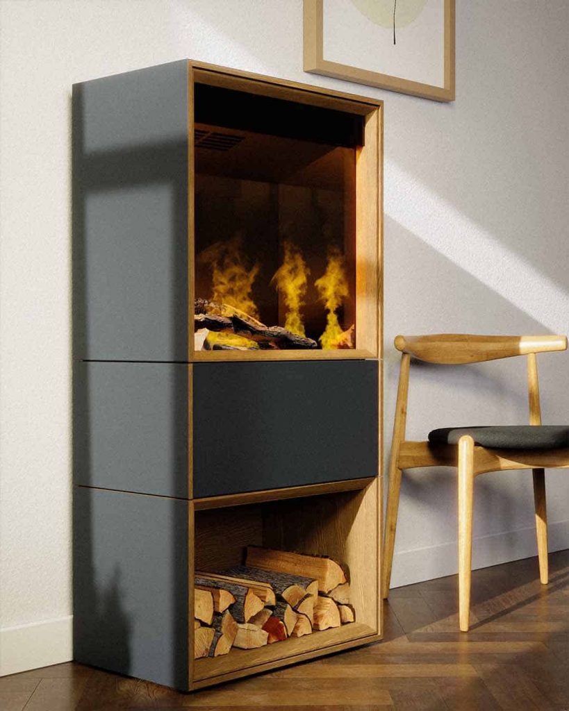 Der Lio kombiniert hochwertiges Handwerk mit elegantem, natürlichem Materialmix: Ein Korpus aus massiver, geölter Eiche trifft auf edles Linoleum (wahlweise in verschiedenen Farben). Damit wird der Kamin nicht nur zur Wärmequelle, sondern zum stilvollen Möbelstück, das sich harmonisch in verschiedene Wohnstile einfügt.